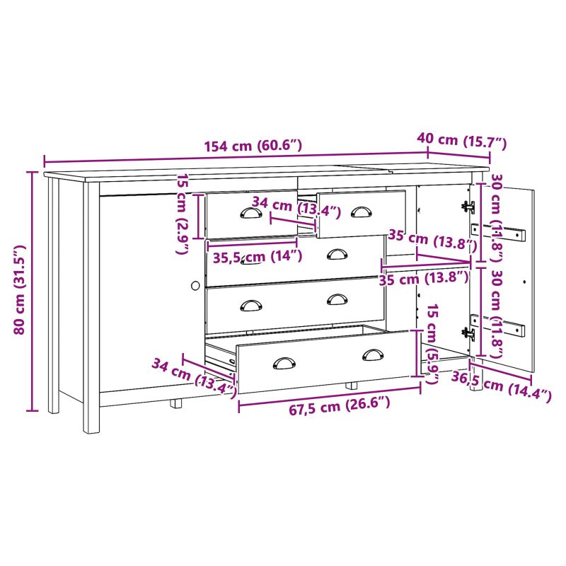 Този елегантен страничен шкаф е идеалното съчетание на стил и функционалност, което ще направи всяка дневна стая още по-привлекателна. Направен от масивна борова дървесина, меденокафявият цвят му помага да се впише в почти всяка декорация, като посреща както естетиката, така и практическите нужди. Качество от масивна борова дървесина: Този шкаф е изработен от първокласна масивна борова дървесина, която добавя естествена топлина и елегантност на всяко помещение. Известна с издръжливостта си, борова дървесина обещава дългосрочно решение за съхранение, което запазва привлекателността си с времето. Функционален дизайн: С врати на 90° и здрави чекмеджета, шкафът осигурява бърз достъп до всичко, което съхраняваш. D-дръжките правят отварянето лесно, а стилният, минималистичен дизайн с елегантни линии добавя визуална привлекателност, подходяща за съвременни интериори. Разнообразни възможности за съхранение: Този шкаф предлага много място, включително основни отделения и чекмеджета, за да организираш всичко, от посуда до книги - идеален за дневната и трапезарията. Лесен монтаж: За сглобяването му са ти нужни двама човека и основни инструменти, плюс инструкция, за да е всичко лесно. Следвайки стъпките за монтаж, получаваш стабилен шкаф, който е доверен помощник в дома ти. Грижи и поддръжка: Избягвай агресивни химикали при почистване - просто избърсвай с влажна кърпа, за да е в отлично състояние. Редовната поддръжка гарантира, че шкафът остава не само красив, а и практичен.