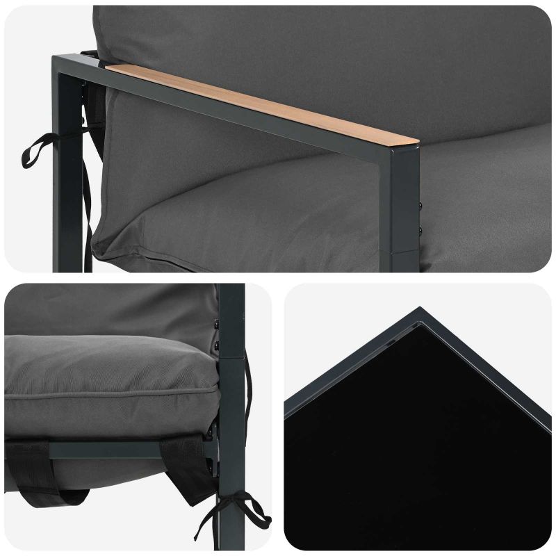 Този модерен комплект градински дивани съчетава стил и практичност, идеален за вашата градина или тераса с изчистен и съвременен дизайн. Създаден е за комфорт и устойчивост, за да предлага уютно място за семейството или за спокойни моменти на самота сред природата. Стилен стоманен корпус Комплектът има солидна стоманена рамка, която предлага стабилност и опора за ежедневна употреба на открито. Прахово боядисаното покритие осигурява дълготрайност, запазвайки добрия вид при всякакви условия на времето. Комфортно сядане Проектиран с наклонен седалка и облегалка, комплектът позволява удобство и релаксация. Меките възглавници осигуряват уют, перфектен за разговори или тихи моменти в градината. Подлакътници с дървесен вид Металните подлакътници имитират естествено дърво, добавяйки топлина. Този детайл увеличава привлекателността и предоставя удобна опора за ръцете. Практични елементи Регулируемите крачета дават възможност за адаптиране на комплекта към неравности, предлагащи по-добро равновесие. Черните плетени ленти стягат основата, добавяйки стабилност и комфорт. Лесна поддръжка Проектиран за удобно ползване на открито, комплектът изисква минимални усилия за поддръжка – просто забърсвайте с влажна кърпа, за да го запазите свеж.
