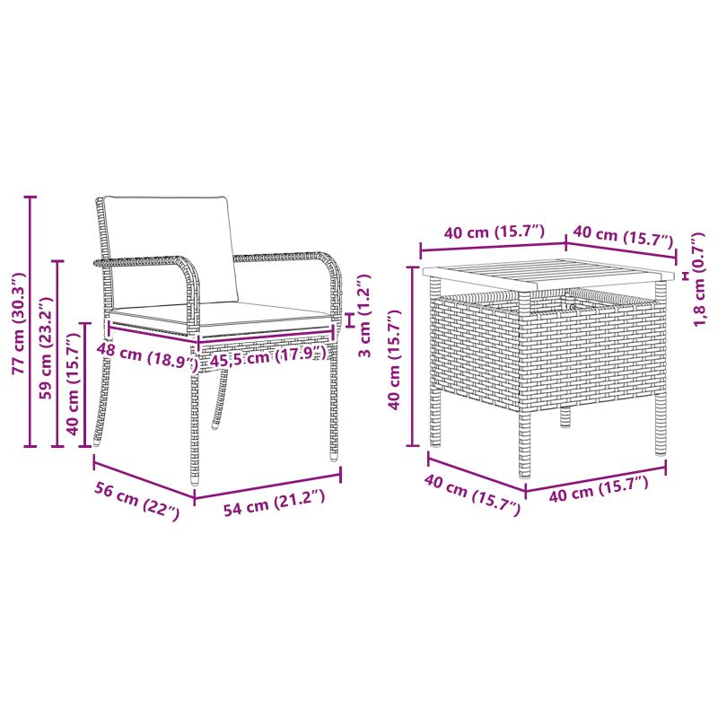Комплектът градински мебели е направен от полиратан и прахово боядисана стомана, за да устои на времето. Включва маса с натурален финиш от акация, която предлага стабилна повърхност за напитки или закуски. Всеки елемент идва с отстраняеми възглавници за лесна поддръжка. Подходящ е за градини, тераси и балкони и изисква само бързо почистване, за да запази вида си. Устойчив на времето: Изработен е от прахово боядисана стомана и полиратан, съчетаващ здравина и устойчивост на атмосферните условия. UV защитата му помага да се запази дори и под горещото слънце. Включени възглавници: Комплектът идва с възглавници за сядане и гръб, за по-голям комфорт. Отстраняемите калъфи лесно се почистват. Устойчивият полиестер осигурява дълготрайно ползване. Многофункционално използване: Подходящ е за всякакви обстановки - тераси, градини или балкони. Функционира идеално за личен релакс или индивидуално ползване. Топка от акация: Масата предлага натурален маслен завършек от акация, осигуряваща стабилна повърхност за хранене и пиене. Лесно почистване: Полиратанът лесно се поддържа, нуждае се само от бърсане и понякога защитно покритие. Съхранявайте възглавниците, когато не се ползват, за да удължите живота им.