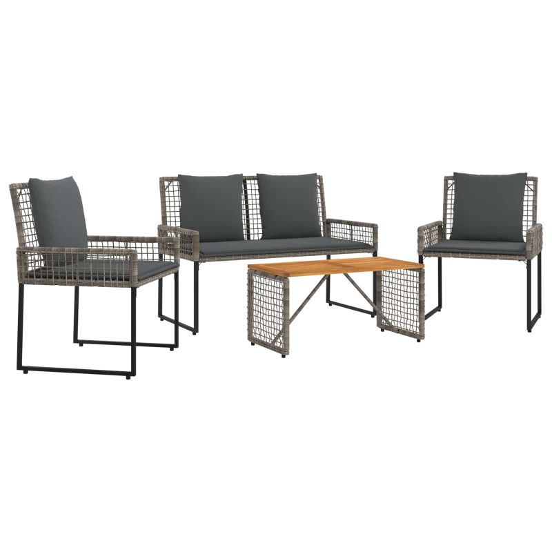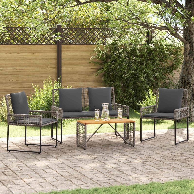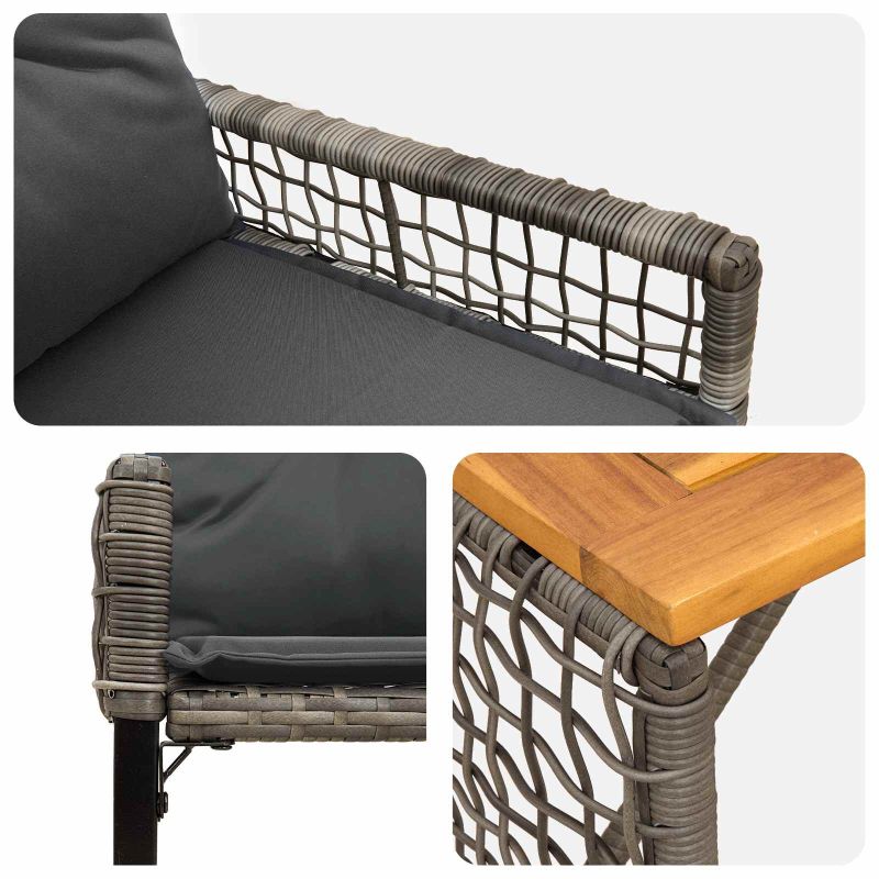 Този модерен комплект градински мебели е за тези, които искат да добавят стил и функционалност в градината или патията си. Идеален за пролетта и лятото, той предлага рустикален шарм, който подчертава естествената красота. Полиратанът придава стилен и спокоен вид, докато уеб тъкаеният модел добавя щипка елегантност на всяка открита обстановка. Представете си как се наслаждавате на съботни следобеди или вечерни партита, които могат да се издигнат на ново ниво с този комплект - перфектен за различни поводи! Привлекателност на естествени материали: С рамка от полиратан и повърхности от масивна акациева дървесина, комплектът съчетава естествена красота с модерен стил. Здравата конструкция осигурява дългогодишно използване, като запазва естетическия си вид. Изчерпателен компонентен дизайн: С завършен заден панел, подвижна седалка и прахово боядисана стоманена рамка, всеки елемент е подбран с грижа за качество и функция. Подлакътниците и трапецовидните крака осигуряват комфорт. Функционален комфорт и стил: Насладете се на удобството с възглавници, които осигуряват пухкаво изживяване. Гърбните възглавници добавят уют, съчетавайки практичност и елегантност. Външна универсалност: Комплектът е подходящ за всякакво открито ползване, предоставяйки комфорт на открито. Издържа на сезона, идеално е за пролетни и летни срещи. Лесна поддръжка: Поддържането е лесно – просто избърсвайте с влажна кърпа. За защита в лошо време покрийте с водоустойчиво покритие.