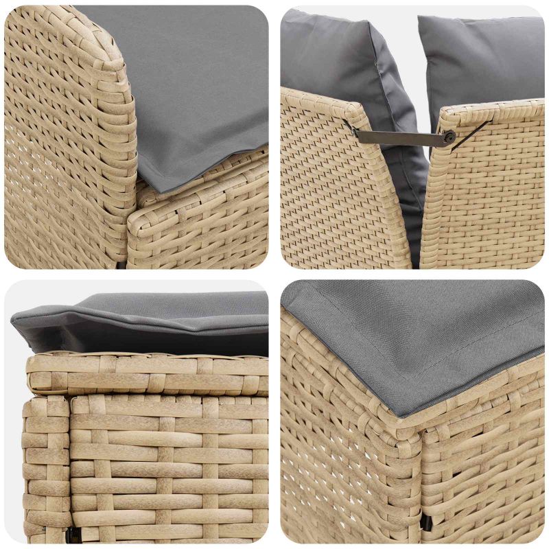 Тази софа с подлакътници в комбинация с ъглова секция е комбинирано решение за стил и функция. Перфектна е за всякаква открита тераса или интериорно пространство. Със своите чисти линии и минималистичен дизайн, тя предлага елегантност и простота. Можеш да я конфигурираш по различни начини, идеална е за събирания, почивка или като основно парче в декора. Материали: Изработена от здрав PE ратан, софата има стилна вплетена структура, която излъчва модерен вид и устойчивост на атмосферни влияния. С прахово боядисана стоманена рамка, тя осигурява стабилност и дълготрайност, идеална както за закрито, така и за открито. Включени компоненти: Лесно свалящите се и с цип възглавници осигуряват комфорт и практичност. Седалката, подлакътниците и нагръдникът са направени от издръжлив полирата, добавяйки стил и надеждност. Характеристики/Функция/Дизайн: Регулируемите крака дават стабилност на неравни терени, осигурявайки комфорт в различни условия. Можеш да настройваш височината, за да създадеш комфортно усещане, което отговаря на твоите нужди. Препоръчителни употреби: Идеална е за открито отдих, Al fresco обяд или за създаване на уют в хола. Със своя модерен дизайн и здраво изграждане, тя отлично пасва за социални събирания или уютно четене в градината. Грижа и поддръжка: За да запазиш стилния вид, покривай софата с водонепромокаем калъф, когато не я ползваш. Възглавниците могат лесно да се свалят и почистват за лесна поддръжка. За поддържане на полирата, просто я избърсвай с влажна кърпа. Сглобяването е най-добре да се извършва с помощта на друг човек.