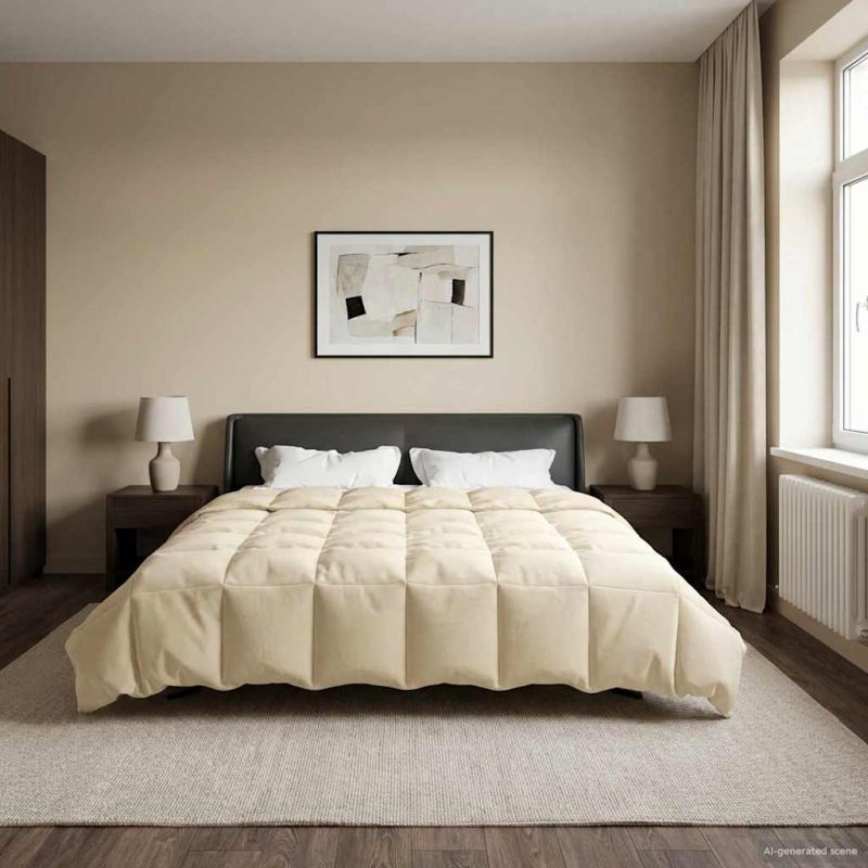 Това дюше е проектирано да превръща спалнята Ви в уютен оазис през цялата година. С модерен вид, чисти линии и удобство, то се комбинира с всеки декор и Ви осигурява максимален комфорт. Независимо дали е студена зима или топло лято, неговият универсален килт патерн е идеалният избор за добър сън. Материал от микрофибър: Дюшето е направено от 100% полиестер, защото е супер меко и устойчиво на гъбички. Създава приятно усещане върху кожата, осигурявайки Ви пълен комфорд всяка нощ. Универсално пълнеще: С иновационно влакно, дюше с неговото стегнато и дишащо пълнеже е идеално за всички сезони. Запазва топлината през зимата и Ви охлажда летните нощи. Килт дизайн: Красивият килт патерн добавя стил и текстура на спалнята. Неговото равномерно разпределение на пълнежа го прави удобно и лесно за маневриране. Дизайн с двустранен плат: Едната страна е мека като кадифе, супер уютна за зимата, а другата е гладка и дишаща, така че да е свежо и в горещите дни. Лесна поддръжка: Може да се пере в машината на студено с подобни цветове. За простота, сушете на ниска температура с тенис топка или просто го разклатете на слънце. Като цяло, дюшето остава свежо без усилия.