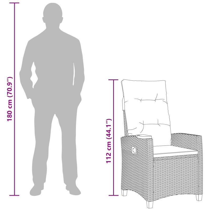 Този модерен recliner стол е стилно допълнение за всеки открит кът. Комбинира функционалност с елегантен дизайн, идеален за градината. Позволява на потребителите да се насладят на природата, докато се радват на модерните линии. Черната прахова стомана много добре допълва ратановото покритие, създавайки красив контраст. Със своята регулируема облегалка, столът осигурява комфорт, подходящ за релаксация или социални срещи. Регулируема облегалка: Открий гъвкавост с ръчно регулируемата облегалка, проектирана за персонализиран комфорт. Просто я настрои на ръка за четене, релаксация или умиротворение на открито. Интегрирана маса: Столът предлага удобна повърхност за напитки, книги или очила. Всичко е под ръка, за да се насладиш на времето си на открито. Устойчив на времето ратан: Столът е изграден да устоява на лошо време с UV защитен ратан. Можеш да бъдеш спокоен, че столът ще изглежда добре и ще е здрав през всички сезони. Двойно облицована възглавница: Наслади се на мекотата на възглавницата, която е плътна с пяна и не се плъзга. Свалящата се възглавница е не само луксозна, но и лесна за поддръжка. Лесна поддръжка: Просто го избърсвай с влажна кърпа; така ще остане свеж с малко усилия, за да можеш да се концентрираш на удоволствието от откритото.