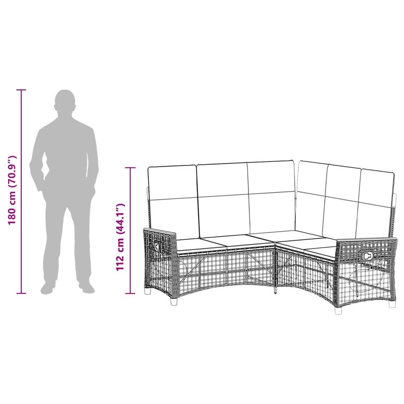 Този модерен комплект градински reclining диван е създаден, за да подобри комфорта на открито. С простота и елегантност, той е идеален за релаксация на тераси и в градини. Практичният му дизайн с изчистени линии създава приятно и спокойно открито пространство, където да се отдъхнете и развлекете. Ратан и стомана в комбинация: Структурата е направена от полиратан и прахово боядисана стомана, съчетавайки модерен вид с издръжливост. Тази комбинация предлага стабилна основа, устойчиво на различни метеорологични условия, което я прави идеална за целогодишно използване на открито. Reclining облегалки: Диванът е проектиран за комфорт, с две reclining облегалки, които могат да се настройват според вашите нужди. Независимо дали четете, обядвате или просто взимате кратка дрямка, ръчната настройка ви дава контрол над позицията. Възглавници с цип: Включва готини възглавници за сядане и опора с цип, осигурявайки комфорт и лесна поддръжка. Пената добавя мекота, създавайки уютно пространство за релакс и развлечения. Устойчиви на времето функции: Дизайнът на дивана е създаден за външни условия, с UV и метеорологично устойчиви функции, така че да запази формата си при всяка ситуация. Стилни подлакътници: С плоски ратанови ръбове, които играят роля и на декоративни елементи, те подчертават чистите линии на конструкцията и добавят към минималистичния чар на дивана, който се съчетава с всякакви градински пространства.