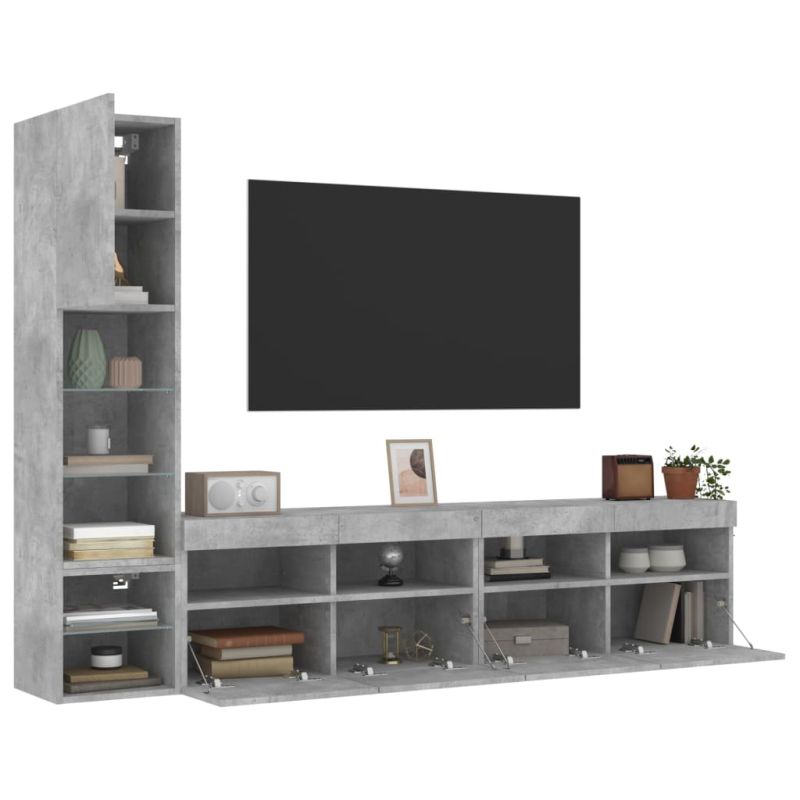 ТВ стенни модули с LED, 4 части, бетонно сиви, инженерно дърво