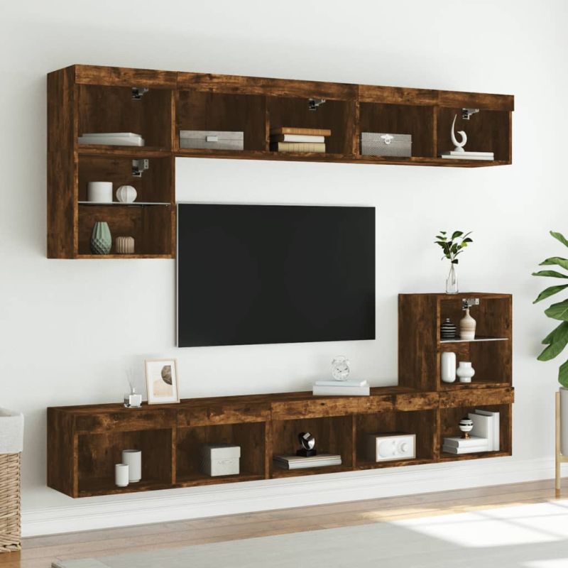 С модерен и същевременно практичен дизайн тези ТВ шкафове с LED осветление ще се превърнат във фокусна точка на вашата стая. Издържлив материал: Инженерната дървесина е с изключително качество с гладка повърхност и също така се отличава със здравина, стабилност и устойчивост на влага. Изработени от инженерно дърво, тези ТВ поставки са здрави и издръжливи.Достатъчно място за съхранение: Тези ТВ модули предлагат достатъчно място за съхранение, за да държите вашите DVD плейъри, приемници, дискове и други дребни предмети добре организирани и достъпни.RGB LED осветление: Тези мебели за мултимедийни устройства разполагат с RGB LED осветление, което има различни менюта за промяна на цвета на светлините и позволяват на цвета да се регулира автоматично.Дизайн със стенен монтаж: Тези шкафове за мултимедийни устройства могат да се монтират на стена за допълнително място за съхранение. По този начин можете да увеличите максимално пространството на пода и да поддържате чистота. Добре е да се знае:Винтовете и дюбелите за вътрешната стена не са включени. Съветваме ви да намерите и използвате винтове и дюбели, подходящи специално за вашите стени. Ако не сте сигурни, можете да се консултирате с професионалист. Моля, прочетете и следвайте всяка стъпка от инструкциите.Продуктът има USB конектор, който изисква сертифициран 5V USB захранващ източник (не е включен). Не използвайте този артикул, ако някой от компонентите е счупен, скъсан или липсва. Този продукт се захранва с DC 5V, но сертифицираният 5V USB източник на захранване не е включен в комплекта. По-високото напрежение може да доведе до прегряване на устройството и да доведе до повреда на устройството и потенциален риск от прегряване и пожар.