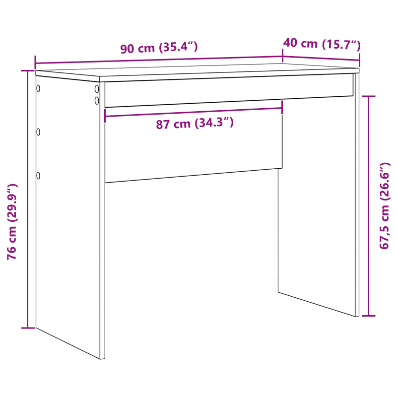 Това компактно бюро за писане е проектирано с внимание към съвременната работа и предлага функционалност, съчетана с красив дизайн. С минималистичен вид и чисти линии, то е идеален избор за малки офиси или домашни работни места, подобряващи пространството без да го натоварват. Структура от качествена дървесина Супер здрава рамка, направена от инженерна дървесина, която гарантира стабилност и дълготрайна употреба. Материалът е устойчив на износване, идеален за ежедневно ползване, като запазва елегантността и функционалността си. Ефективна работна повърхност Плотът без усилия побира компютри и различни нужни вещи, оптимизирайки пространството. Идеален е за лаптопи, монитори и офис принадлежности, като предоставя отлично изживяване за продуктивна работа. Подходящ размер за всяко помещение Бюрото се вписва отлично в всекидневни, офиси и кабинети, лесно се интегрира в различни интериори. Компактните му размери и съвременен дизайн го правят идеално за градски апартаменти, осигурявайки място в съвременна обстановка. Лесно сглобяване Доставя се компактно с ясни указания, изискващи само отвертка. Проектирано за комфорт, бързото сглобяване го прави подходящо за всеки, който иска да организира пространството си бързо и без затруднения. Грижа и поддръжка Поддръжката е изключително лесна — просто го избърсвайте с влажна кърпа, за да запазите стилната му повърхност. Проектирано за вътрешна употреба, бюрото остава устойчиво на ежедневните офис дейности.