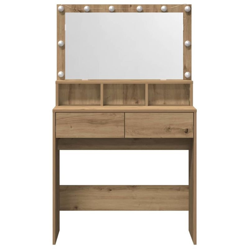 Тази стилна маса за грим е супер фокусна точка за всяка спалня с елегантния си дизайн и много място за съхранение. Правоъгълната ѝ форма предлага модерна визия и е същевременно функционална за зоната за гримиране. Инженерна дървесина: Тази маса е направена от инженерна дървесина, която осигурява здравина и дълговечност в интериора на спалнята. Повърхността ѝ е гладка и лесно влиза в съвременния стил на стаята. Интегрирани компоненти: Масата е с плоско огледало и LED светлини, които осигуряват комфорт и удобство. Светлината се контролира лесно с бутон. Функционални характеристики: Много чекмеджета и голям рафт предлагат организирано съхранение на лични вещи, а дизайнът максимизира удобството за ежедневното ползване. Универсално използване: Идеална е за спални или зони за гримиране, тази маса може да събира много козметика и аксесоари. Стилният ѝ дизайн се вписва чудесно в съвременния интериор. Поддръжка и грижа: Лесно се поддържа с почистване с суха кърпа. Правете периодични проверки на LED светлините и USB плъга за дълготрайна устойчивост и качество. Моля, обърнете внимание, че трябва да използвате само сертифициран вход DC 5V. По-високото напрежение може да доведе до прегряване и повреда на устройството и потенциален риск от пожар. Не свързвайте този продукт към захранване, различно от описаното в ръководството, на табелката с данни или изрично препоръчано от vidaXL. Този уред не трябва да се използва от деца под 15 години, както и от лица с намалени физически, сетивни или умствени способности или с липса на опит и познания относно използването на електронни уреди. Електричеството е опасно. Повредите и неправилният монтаж, употреба или модификации (подмяна на отделни компоненти) могат да доведат до повреда на уреда, което да доведе до токов удар и опасност за потребителя. Не използвайте този продукт във взривоопасна атмосфера, като например при наличие на запалими течности, газове и прах, или при температура над 50 градуса по Целзий. Не включвайте продукта, ако свързващият кабел или захранването са видимо повредени. Ако външният гъвкав кабел или захранващ кабел на това осветително тяло е повреден, той трябва да бъде заменен изключително от производителя или негов сервизен агент, или от подобно квалифицирано лице, за да се избегне опасност. Изключете захранването по време на монтажа и поддръжката. Уверете се, че крушките са изстинали. Светлинният източник на това осветително тяло не може да се заменя. Когато светлинният източник достигне края на своя живот, цялото осветително тяло трябва да се замени. Само за употреба на закрито, не използвайте този продукт на открито.