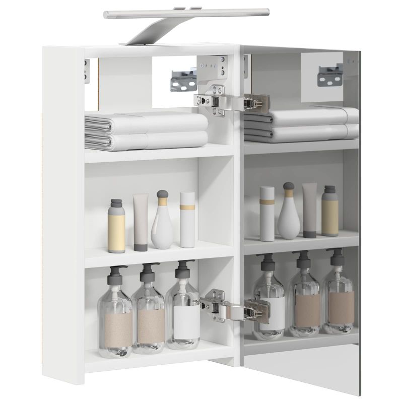 Този модерен огледален шкаф е супер практичен и стилен. Сладостта на дизайна му съчетава елегантни линии и минималистичен вид, който подхожда на всяка баня. Осигурява достатъчно място за основните неща, а двупосочното огледало удобно комбинира отражения с ясна видимост. Изработка от инженерна дървесина: Здравият шкаф е направен от качествени материали, които му осигуряват дълготрайност. Гладкото покритие придава модерен прочит и не позволява задържане на замърсявания. Двупосочно огледало: С две страни, които работят за различни нужди - от ежедневна грижа до забавление, докато се подготвяте. Дизайн с монтаж на стена: Шкафът се монтира на стената, за да спести място в движението, а същевременно е модерен и елегантен. Рафтчета от плоскости: Осигуряват организирано съхранение за козметика и принадлежности, без да заемат много място. Достъп с панти: Вратите с панти се отворят лесно и тихо, без да нарушават спокойствието на вашата баня. Моля, обърнете внимание, че трябва да използвате само сертифициран вход DC 5V. По-високото напрежение може да доведе до прегряване и да повреди устройството, както и до потенциален риск от прегряване и пожар. Не свързвайте този продукт към захранване, различно от описаното в ръководството, на табелката с името или изрично препоръчано от vidaXL. Този уред не трябва да се използва от деца под 15 години, както и от лица с намалени физически, сетивни или умствени способности или с липса на опит и познания относно използването на електронни уреди. Електричеството е опасно. Повредите и неправилният монтаж, употреба или промяна (подмяна на отделни компоненти) могат да доведат до повреда на уреда , което да доведе до токов удар и опасност за потребителя. Не използвайте този продукт във взривоопасна атмосфера, като например при наличие на запалими течности, газове и прах, или при температура над 50 градуса по Целзий или повече. Не включвайте продукта, ако свързващият кабел или захранването са видимо повредени. Ако външният гъвкав кабел или захранващ кабел на това осветително тяло е повреден, той трябва да бъде заменен изключително от производителя или негов сервизен агент, или от подобно квалифицирано лице, за да се избегне опасност. Изключете захранването по време на монтажа и поддръжката. Уверете се, че крушките са изстинали. Светлинният източник на това осветително тяло не може да се заменя; когато светлинният източник достигне края на експлоатационния си срок, цялото осветително тяло трябва да се замени. Само за употреба на закрито, не използвайте този продукт на открито.