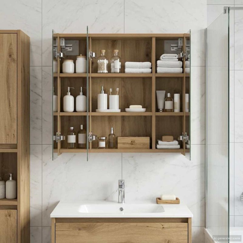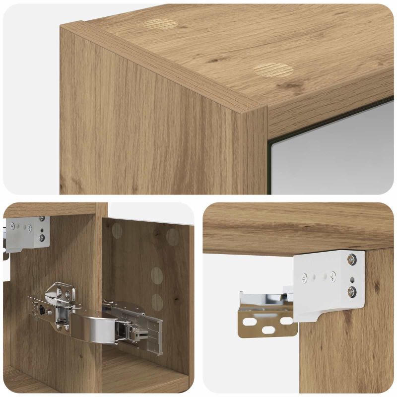 Този модерен огледален шкаф за баня съчетава стил и функционалност с простия си правоъгълен дизайн, който е перфектен за съвременните бани. Комбинира простота с полезност, идеално за всяка баня и предлага практични решения за съхранение. С двустранното огледало и регулируемите си функции, той лесно се интегрира в домашната обстановка. Конструкция от инженерна дървесина : Изработен от здрав инженерна дървесина, този шкаф е стабилен и издръжлив - перфектен за съвременните бани. Дървесината устои на промени и запазва своя вид с течение на времето. Двупосочно огледало : Този шкаф има иновативно двустранно огледало, което комбинира отражение и прозрачност. Полезно за тези, които искат малко уединение, особено в споделени пространства. Лесно откриване с врати на панти : Вратите отварят лесно, осигурявайки бърз достъп до всичко вътре. Няма усилия, за да достигнете нужните неща, което прави ежедневието по-лесно. Регулируеми рафтове : С регулируеми рафтове, вие можете сами да подредите вътрешността според нуждите си. Перфектно за разполагане на всякакви тоалетни принадлежности. Удобство при стенен монтаж : Стенният дизайн спестява място и добавя изчистен вид. Особено полезно за по-малки бани, където е важно да се оптимизира пространството.