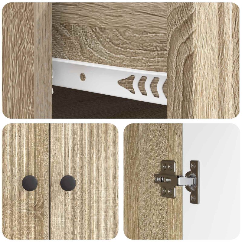 Тази секция е страхотно допълнение за вашия хол или трапезария. Осигурява достатъчно място за съхранение и прави всичко да изглежда с винтидж стил. Правоъгълната й форма е изработена от иновационна дървесина, която веднага се вписва в декора, без да загуби функционалността на помещението. Каквото и да търсите, тази секция ще внесе стил и елегантност навсякъде. Изработка от иновационна дървесина Секцията е изградена от иновационна дървесина, което я прави здрава и дълготрайна. Лесна за почистване и с привлекателен вид, тя е идеална за заети домове. Този материал е устойчив на деформации и напуквания, което осигурява надеждност. Просторно място за съхранение С множеството рафтове, чекмеджета и врати с 90° панти, секцията е проектирана да отговаря на всевъзможни нужди за организация. С тях можете лесно да подредите прибори, покривки или лични вещи, поддържайки всичко подредено. Винтидж стил Стилът й подчертава винтидж вдъхновения, като внася изтънченост в модерните интериори. Приказното присъствие усилва традиционния и съвременен декор, а металните дръжки добавят стил и лесен достъп. Сигурност и стабилност С опция за прикрепване към стената, можете да сте спокойни. Това е особено важно за домове с деца или домашни любимци, запазвайки елегантния й вид. Лесна поддръжка Просто избърсвайте секцията с влажна кърпа, за да я поддържате в добро състояние. Минималната поддръжка е удобна, а стилът остава безупречен и привлекателен.