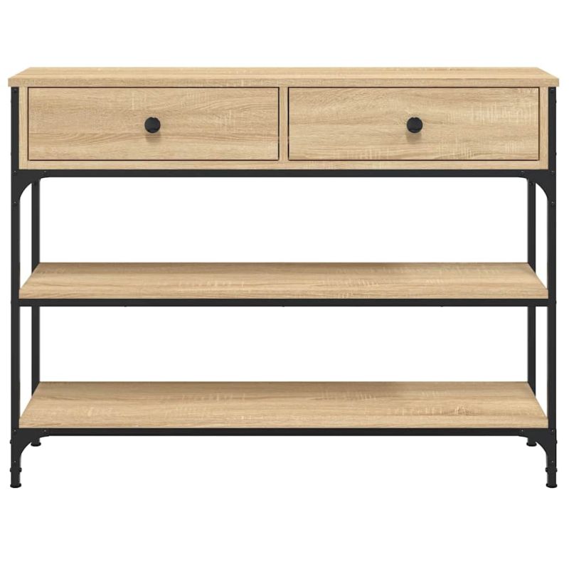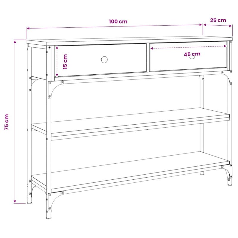 Добавете нотка елегантност към вашето антре, всекидневна или коридор с тази стилна конзолна маса. Издържлив материал: Инженерната дървесина е с изключително качество с гладка повърхност и също така се отличава със здравина, стабилност и устойчивост на влага. Изработена от инженерно дърво, холната маса е лесна за почистване.Достатъчно място за съхранение: Холната маса предлага достатъчно място за съхранение, за да съхранявате вашите списания, книги, декоративни предмети и други ежедневни неща добре организирани и на достъпно място.Регулируеми крачета: Четири регулируеми крачета с пластмасови подложки поддържат страничната масичка балансирана на неравен терен и увеличават стабилността.Метална рамка: Металната рамка добавя индустриален стил към вашия интериор, като същевременно гарантира издръжливост и стабилност. Внимание:За предотвратяване на преобръщане този продукт трябва да се използва с предоставения анкер за стена.