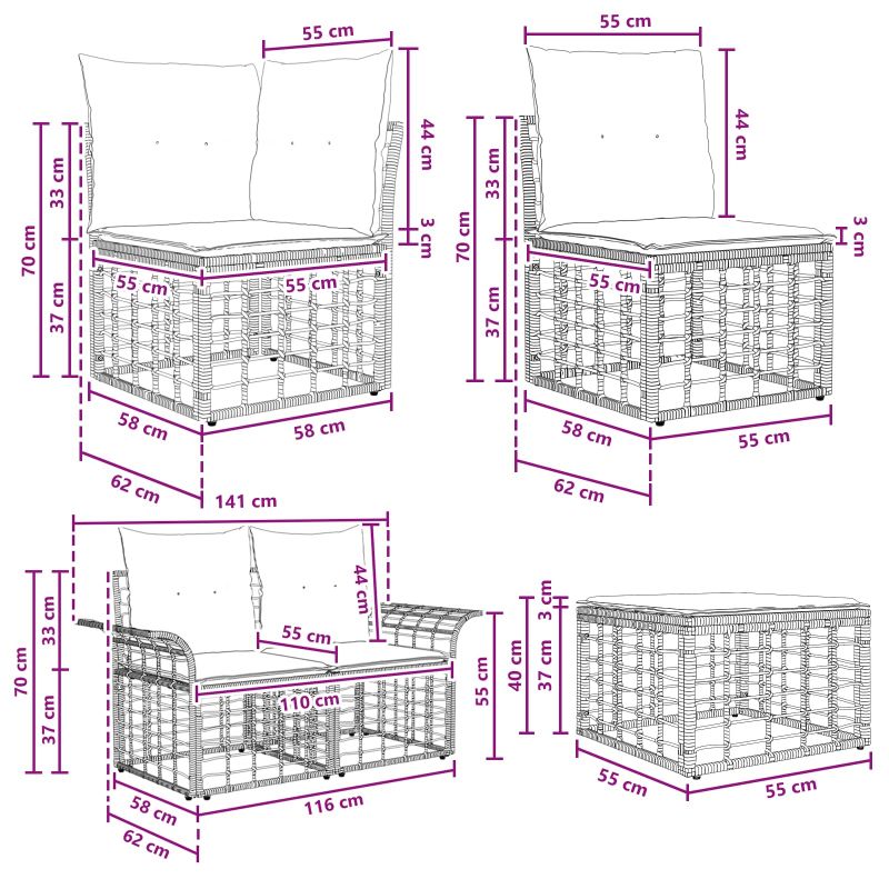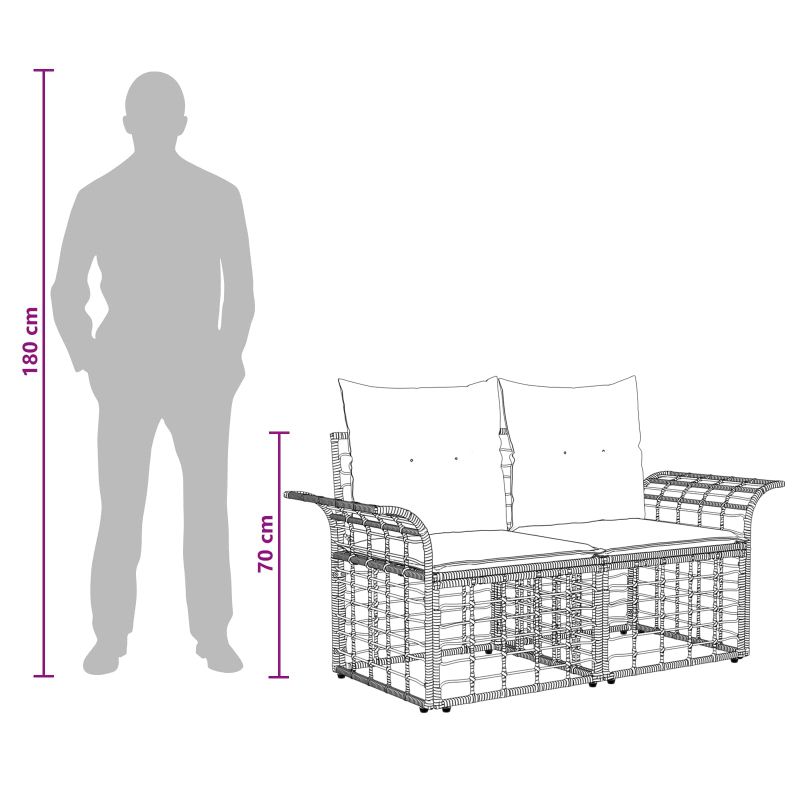 Този секционен диван за открито е перфектната комбинация от стил и функционалност за вашата градина или тераса. Със своя рустикален вид и материали като полиратан и полиестер, той е прекрасно допълнение за всяко открито пространство. Размерите му от 70.5 x 62 x 70 см обещават удобство, а праховото покритие гарантира здравина на открито. Устойчив полиратан : Използваме полиратан за рамките и подлакътниците, с класически рустикален дизайн и дълготрайност. Този материал лесно се справя с условията на открито, плюс стилен и функционален комплект. Удобно изживяване при сядане : Възглавниците с пяна и полипропиленови влакна предлагат супер комфорт. Сваляеми са и лесни за поддръжка, с бърза клапа за сваляне, което прави грижата за тях лесна. Модулна гъвкавост : Можете да настроите разположението на този комплект, за да се побере в всяко пространство или за всякакви случаи благодарение на модулния му дизайн. Дали ще организирате парти или просто ще се наслаждавате на вечер, секциите лесно ще отговорят на нуждите ви. Характеристики, устойчиви на времето : Материалите като полиестер и полиратан правят комплекта устойчив на опити от слънце и дъжд. Няма нужда да се притеснявате за повреди – той ще ви служи дълго време. Лесно почистване и поддръжка : За да поддържате комплекта, избягвайте пряка слънчева светлина и използвайте покривала, когато не го ползвате. Редовното избърсване с влажна кърпа му осигурява свежест, а свалящите се възглавници правят почистването лесно.
