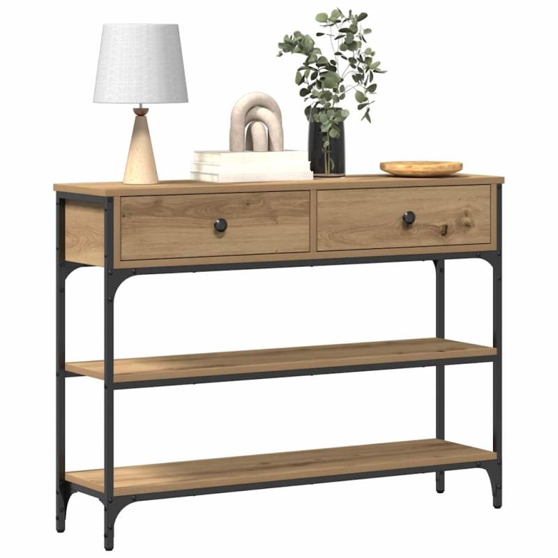 Тази конзолна маса има елегантен и практичен дизайн, идеална за всекидневната. Правоъгълната форма я прави изящна и удобна за поставяне до стената, предоставяйки пространство за дисплей и съхранение. Подходяща за любителите на индустриалния стил, тази маса комбинира инженерна дървесина и стомана за здравина и издръжлив вид. Отлична за градски или лофт интериори, тя добавя съвременен акцент във всяко пространство. Материали: Конзолната маса се състои от инженерна дървесина и стомана, което ѝ дава здрава и естетически привлекателна структура. Изправената дървесина предлага гладка повърхност, докато стоманената рамка осигурява надеждност в съвременен интериор. Включени компоненти: С плоските рафтове от инженерна дървесина, масата ефективно максимизира пространството за съхранение. Включва стилни чекмеджета, добри за организиране на основни предмети. Стоманените крака не просто допълват индустриалния дизайн, но и осигуряват стабилна основа. Характеристики / Функция / Дизайн: Тази маса предлага дисплей и практичност. Има елегантни черни регулируеми крака за равнина на неравни повърхности. Индустриалният й стил добавя към функционалността, правейки я полезна за различни стаи. Препоръчвани употреби: Масата е универсална – идеална за всекидневни, коридори или входове. Фигурата ѝ е перфектна за малки пространства, предлагаща стил и функционалност. Може да се използва за декорация или за практична повърхност. Поддръжка и поддържане: Сглобяването е лесно с ясни инструкции и отвертка. Поддръжката е бърза – просто избърсвай с влажна кърпа за дълготрайна чистота. Избягвай агресивни химикали, за да запазиш повърхностната ѝ красота.