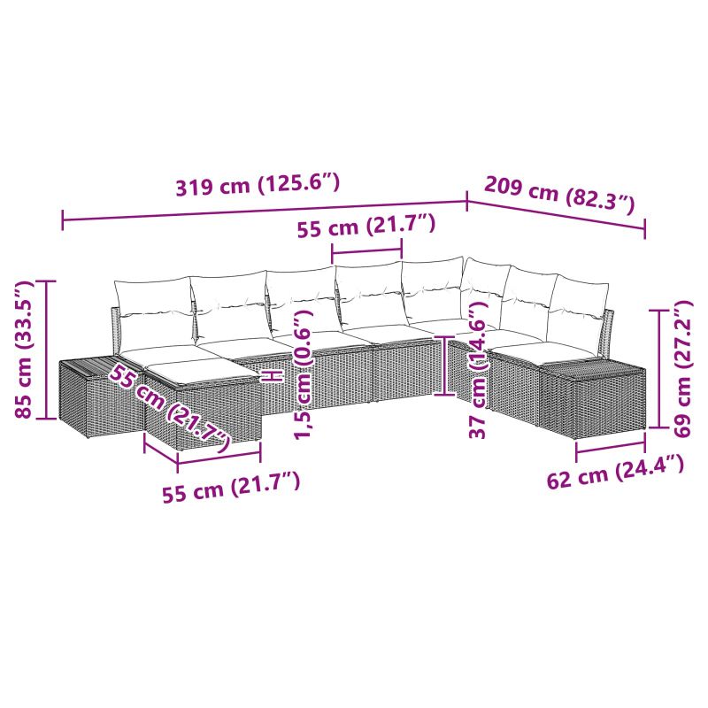 Този комплект градински дивани с възглавници е точно това, от което се нуждаете за вашата тераса или градина. Предлага идеална комбинация от стил и удобство. Проектиран с минималистичен и елегантен вид, той лесно се вписва почти навсякъде, давайки ви удобно място за сядане. Модулният му дизайн позволява представителни решения, които лесно се променят според личните нужди. Подходящ е за всички, които търсят удобство и атрактивен дизайн на открито. Материал Полиратан: Повърхностите на дивана са направени от качествен полиратан, който не избледнява и изглежда добре. Той е идеален за всякакви метеорологични условия и е перфектен за навън. Включени Възглавници: С включените удобни възглавници, комплектът предлага комфорт. Те са устойчиви на атмосферни влияния и са проектирани да траят дълго. Препоръчва се да се прибират при лошо време, за да запазят качеството си. Прахово Боядисана Рамка: Стоманената рамка е прахово боядисана, за да осигури стабилност и дълготрайност, запазвайки формата на дивана. Модулна Конфигурация: Диванът лесно променя формата си, за да отговори на различни нужди, което го прави многофункционален за всякакви събирания. Грижа и Поддръжка: Използвайте покривало, когато не ползвате комплекта. Възглавниците трябва да се прибират вътре при лошо време, за да запазите вид и дълголетие.