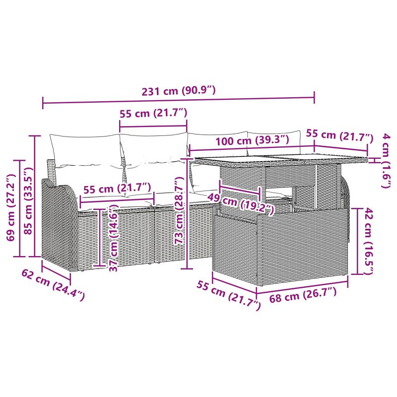 Този модуларен комплект градински дивани е тотален хит на открито, с простички линии и шикозен вид. Съставен от модулни единици за сядане, можеш да пренастроиш градината или терасата по свой вкус - от романтични разговори до организиране на големи събирания. Освежи откритото си пространство с този модерен диван, перфектен за слънчеви следобеди и спокойни нощи под звездите. Богатата текстура на комплекта добавя шик на двора или терасата и става естетичен акцент. Модерен завършек от полиратан: Комплектът дивани изглежда супер стилно с полиратан, проектиран да устойчив на времето и да изглежда елегантно. Уникалното му плетене привлича погледа и ще допълни всяка градина, като носи свежест на открито. Супер устойчив на атмосферни влияния, така че да сияе независимо от дъжд или слънце. Гъвкави модулни елементи: Преобрази откритото си пространство с модулната функционалност на комплекта. Независимо дали искаш уютен кът или обширни секции, можеш да обърнеш и пренаредиш столовете и масите и да създадеш безкрайни конфигурации за забавления. Интегрирани решения за съхранение: Вградените решения за съхранение помагат за удобното прибиране на градински аксесоари и допълнителни възглавници. Тази функция гарантира, че всеки елемент добавя стойност и поддържа градинката ти в ред. Полиестерни възглавници и подложки: Отпусни се с пълните с пяна и полиестер възглавници. Те са UV устойчиви и предлагат мекота и комфорт, които остават запазени дори след дълги дни на слънце. Лесна поддръжка: Грижата за комплекта е супер лесна. Просто покривай диваните, когато не ги ползваш, за да ги запазиш свежи, и давай малко внимание на поддръжката, само с кърпа. И ето, готово! Силно устойчиви за години напред.