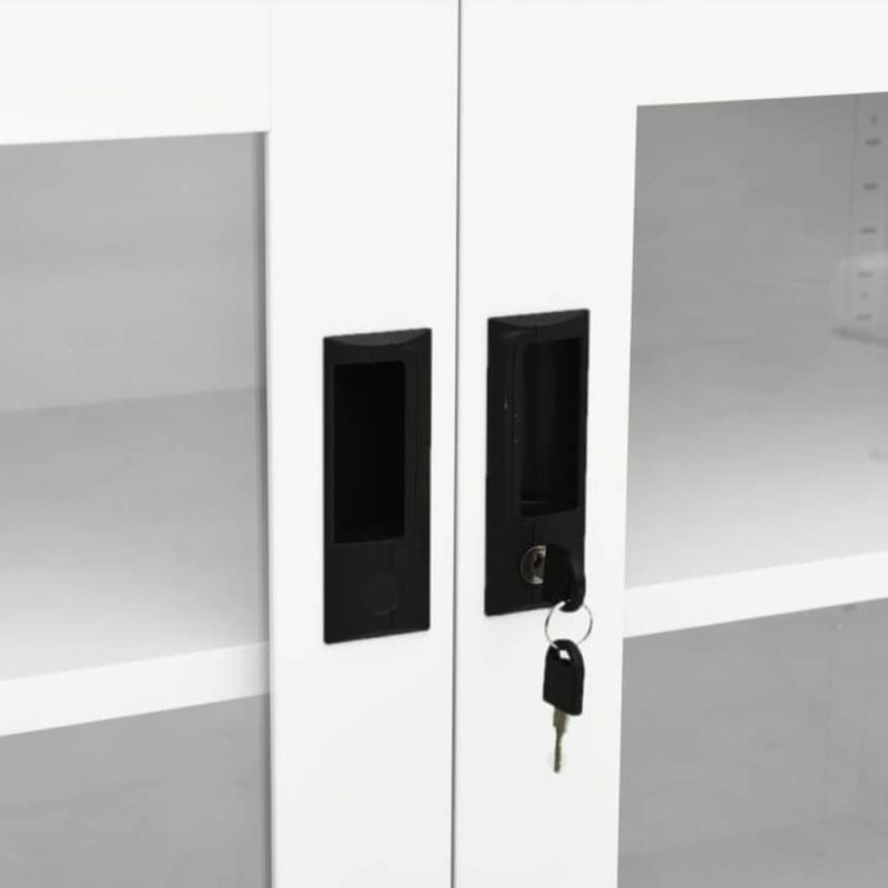 Този офис шкаф в типичен дизайн на шкаф за архивиране е идеален за съхранение на файлове. С регулируем рафт и ключалка, този офис шкаф ви позволява да сортирате вашите папки в различни категории и да ги съхранявате в безопасност. Той ще подхожда на всеки офис декор, благодарение на емблематичния си дизайн. Характерните врати от закалено стъкло улесняват прегледа и намирането на желаната папка. Този офис шкаф е изработен от стомана, което го прави издръжлив и лесен за почистване.