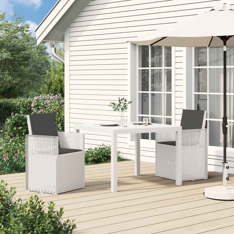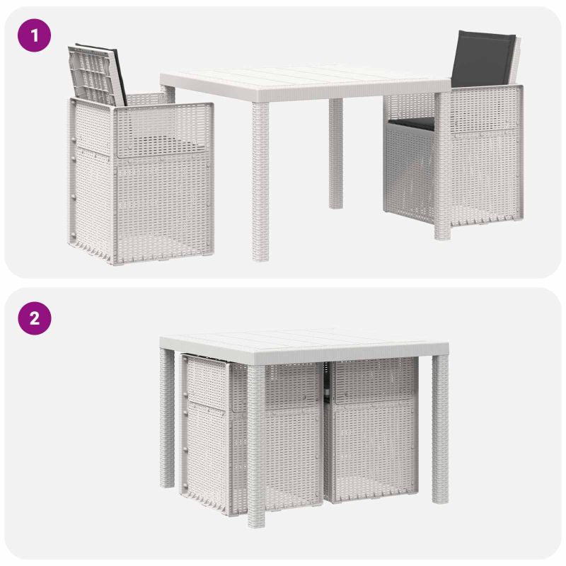 Този комплект за хранене на открито комбинира практичен дизайн с удобно използване за балкони и градини. Направен от дълготрайни материали, той е идеален за ежедневно ползване. С простота във визията си, той лесно се вписва в различни външни среди. Проектиран с удобство на преден план, предложеното място осигурява перфектно решение за сядане и хранене. Здраво изграждане: Масата и столовете са от полипропилен и пластмаса, осигурявайки устойчива основа за всяка употреба на открито. Със свойства на устойчивост на климатични условия и UV, комплектът е направен да издържа на обичайното време, поддържайки висока производителност. Удобни столове: Напълнени с пяна, седалките и подложките предлагат лека и стабилна опора за всекидневно сядане. Пяната осигурява комфорт, намалявайки твърдото усещане на повърхностите. Дизайн с пречупване: Механизмът позволява облегалката на столовете лесно да се сгъва, което ги прави удобни за съхранение под по-високите маси. Този практичен подход спомага за икономия на място и поддържа организираност в пространствата за хранене. Универсално използване: Идеален за различни външни условия, този комплект е перфектен за всякакви поводи. Подходящ е за балкони, градини или дворове, осигурявайки комфортно място за неформално хранене, отпиване или събиране на хора. Лесно сглобяване и поддръжка: Комплектът се сглобява лесно с основни инструменти. Също така, поддръжката му е проста – просто избърсвайте с влажна кърпа, за да го запазите в добро състояние при редовна употреба на открито.