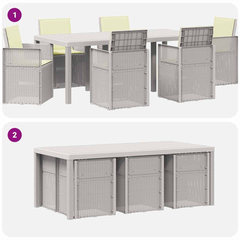 Този комплект за хранене на открито комбинира практичен дизайн с удобно използване за балкони и градини. Направен от дълготрайни материали, той е идеален за ежедневно ползване. С простота във визията си, той лесно се вписва в различни външни среди. Проектиран с удобство на преден план, предложеното място осигурява перфектно решение за сядане и хранене. Здраво изграждане: Масата и столовете са от полипропилен и пластмаса, осигурявайки устойчива основа за всяка употреба на открито. Със свойства на устойчивост на климатични условия и UV, комплектът е направен да издържа на обичайното време, поддържайки висока производителност. Удобни столове: Напълнени с пяна, седалките и подложките предлагат лека и стабилна опора за всекидневно сядане. Пяната осигурява комфорт, намалявайки твърдото усещане на повърхностите. Дизайн с пречупване: Механизмът позволява облегалката на столовете лесно да се сгъва, което ги прави удобни за съхранение под по-високите маси. Този практичен подход спомага за икономия на място и поддържа организираност в пространствата за хранене. Универсално използване: Идеален за различни външни условия, този комплект е перфектен за всякакви поводи. Подходящ е за балкони, градини или дворове, осигурявайки комфортно място за неформално хранене, отпиване или събиране на хора. Лесно сглобяване и поддръжка: Комплектът се сглобява лесно с основни инструменти. Също така, поддръжката му е проста – просто избърсвайте с влажна кърпа, за да го запазите в добро състояние при редовна употреба на открито.
