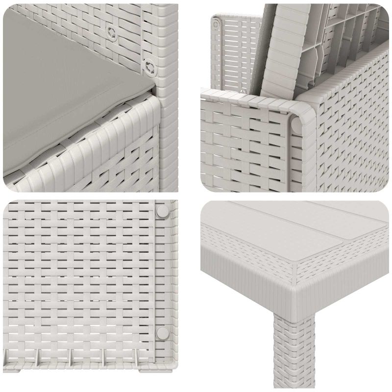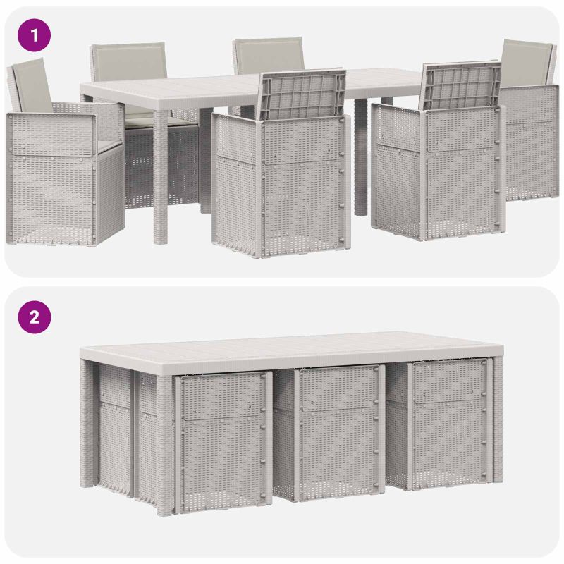 Този комплект за хранене на открито комбинира практичен дизайн с удобно използване за балкони и градини. Направен от дълготрайни материали, той е идеален за ежедневно ползване. С простота във визията си, той лесно се вписва в различни външни среди. Проектиран с удобство на преден план, предложеното място осигурява перфектно решение за сядане и хранене. Здраво изграждане: Масата и столовете са от полипропилен и пластмаса, осигурявайки устойчива основа за всяка употреба на открито. Със свойства на устойчивост на климатични условия и UV, комплектът е направен да издържа на обичайното време, поддържайки висока производителност. Удобни столове: Напълнени с пяна, седалките и подложките предлагат лека и стабилна опора за всекидневно сядане. Пяната осигурява комфорт, намалявайки твърдото усещане на повърхностите. Дизайн с пречупване: Механизмът позволява облегалката на столовете лесно да се сгъва, което ги прави удобни за съхранение под по-високите маси. Този практичен подход спомага за икономия на място и поддържа организираност в пространствата за хранене. Универсално използване: Идеален за различни външни условия, този комплект е перфектен за всякакви поводи. Подходящ е за балкони, градини или дворове, осигурявайки комфортно място за неформално хранене, отпиване или събиране на хора. Лесно сглобяване и поддръжка: Комплектът се сглобява лесно с основни инструменти. Също така, поддръжката му е проста – просто избърсвайте с влажна кърпа, за да го запазите в добро състояние при редовна употреба на открито.