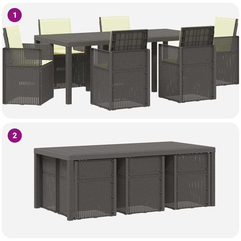 Този комплект за хранене на открито комбинира практичен дизайн с удобно използване за балкони и градини. Направен от дълготрайни материали, той е идеален за ежедневно ползване. С простота във визията си, той лесно се вписва в различни външни среди. Проектиран с удобство на преден план, предложеното място осигурява перфектно решение за сядане и хранене. Здраво изграждане: Масата и столовете са от полипропилен и пластмаса, осигурявайки устойчива основа за всяка употреба на открито. Със свойства на устойчивост на климатични условия и UV, комплектът е направен да издържа на обичайното време, поддържайки висока производителност. Удобни столове: Напълнени с пяна, седалките и подложките предлагат лека и стабилна опора за всекидневно сядане. Пяната осигурява комфорт, намалявайки твърдото усещане на повърхностите. Дизайн с пречупване: Механизмът позволява облегалката на столовете лесно да се сгъва, което ги прави удобни за съхранение под по-високите маси. Този практичен подход спомага за икономия на място и поддържа организираност в пространствата за хранене. Универсално използване: Идеален за различни външни условия, този комплект е перфектен за всякакви поводи. Подходящ е за балкони, градини или дворове, осигурявайки комфортно място за неформално хранене, отпиване или събиране на хора. Лесно сглобяване и поддръжка: Комплектът се сглобява лесно с основни инструменти. Също така, поддръжката му е проста – просто избърсвайте с влажна кърпа, за да го запазите в добро състояние при редовна употреба на открито.