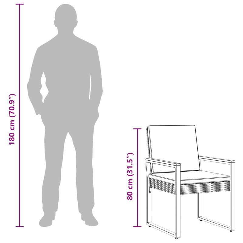 Създаден с мисъл за стил и издръжливост, този комплект градински мебели комбинира елегантен вид с практични функции. Ръбестата маса му позволява да отвежда вода, а прахово боядисаната стоманена рамка е стабилна и устойчива на времето. Подвижните възглавници осигуряват комфорт и лесна поддръжка, правейки комплекса идеален за релакс, хапване или събирания в градини, патии или балкони. Устойчиви на времето материали: Комплектът градински мебели е направен от полиратан, който изглежда естествено и е идеален за външна употреба. Устойчив е на UV лъчи и е проектиран да запази цвета и структурата си дори при променливи условия. Прахово боядисана стоманена рамка: Здрава прахово боядисана стоманена рамка, която съчетава сила и устойчивост с елегантно покритие. Плътността предпазва от ръжда и корозия, осигурявайки стабилност при различни метеорологични условия. Ръбеста маса от акациева дървесина: Масата с ръбест дизайн е направена от здрава акациева дървесина, обработена с натурално масло за приятно усещане. Ръбестият стил позволява лесно отвеждане на водата и добавя елегантност на откритото пространство. Подвижни седални възглавници: Завършени с подложки, тези столове предлагат удобно сядане за дълго време. Възглавниците са подвижни, което позволява лесно почистване и повишава комфорта за отдих. Универсална употреба: Този комплект е проектиран за разнообразни открити среди – градини, патии, балкони и дворове. Със стилния си дизайн, той е отличен за релаксация, хапване или социализиране, добавяйки комфорт и практичност навсякъде.