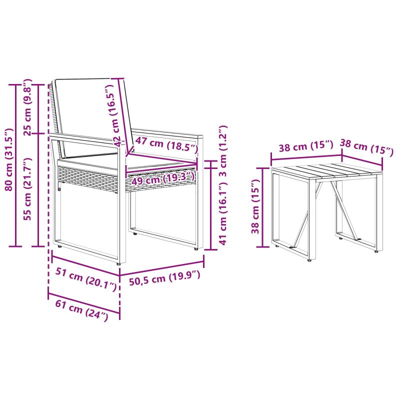 Създаден с мисъл за стил и издръжливост, този комплект градински мебели комбинира елегантен вид с практични функции. Ръбестата маса му позволява да отвежда вода, а прахово боядисаната стоманена рамка е стабилна и устойчива на времето. Подвижните възглавници осигуряват комфорт и лесна поддръжка, правейки комплекса идеален за релакс, хапване или събирания в градини, патии или балкони. Устойчиви на времето материали: Комплектът градински мебели е направен от полиратан, който изглежда естествено и е идеален за външна употреба. Устойчив е на UV лъчи и е проектиран да запази цвета и структурата си дори при променливи условия. Прахово боядисана стоманена рамка: Здрава прахово боядисана стоманена рамка, която съчетава сила и устойчивост с елегантно покритие. Плътността предпазва от ръжда и корозия, осигурявайки стабилност при различни метеорологични условия. Ръбеста маса от акациева дървесина: Масата с ръбест дизайн е направена от здрава акациева дървесина, обработена с натурално масло за приятно усещане. Ръбестият стил позволява лесно отвеждане на водата и добавя елегантност на откритото пространство. Подвижни седални възглавници: Завършени с подложки, тези столове предлагат удобно сядане за дълго време. Възглавниците са подвижни, което позволява лесно почистване и повишава комфорта за отдих. Универсална употреба: Този комплект е проектиран за разнообразни открити среди – градини, патии, балкони и дворове. Със стилния си дизайн, той е отличен за релаксация, хапване или социализиране, добавяйки комфорт и практичност навсякъде.
