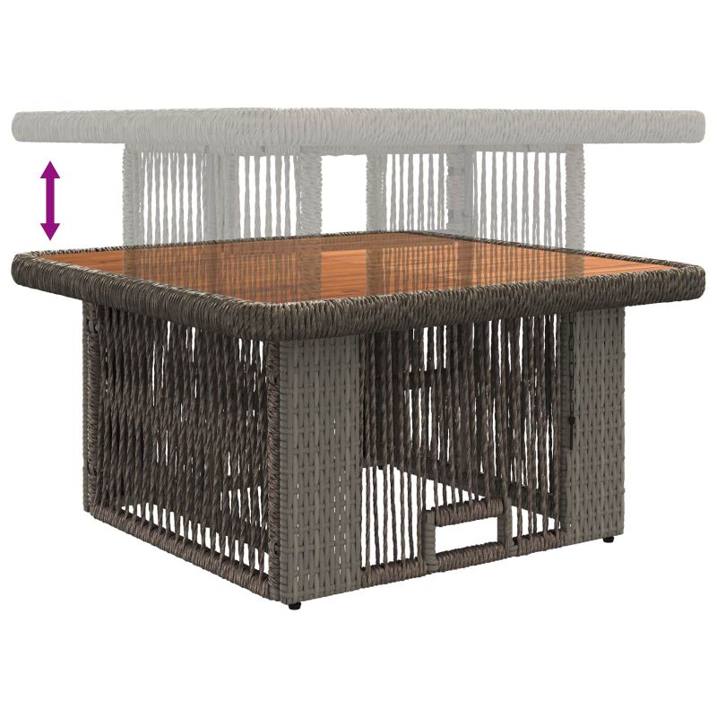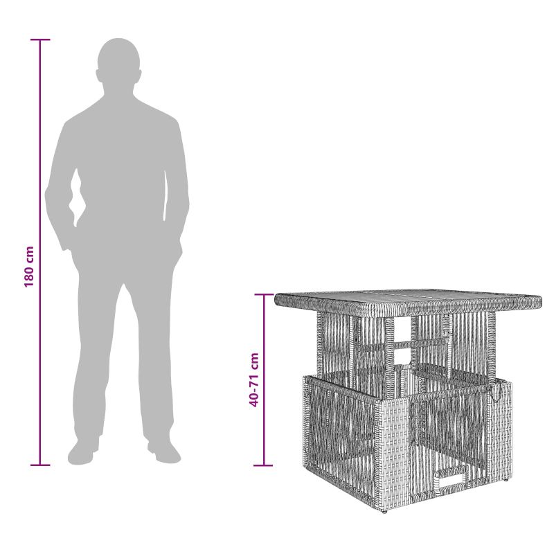 Този комплект за хранене в градината е супер стилен и готин за всяко открито пространство, съчетавайки естествената красота на полиратан и акациево дърво с устойчиви на времето и UV материали. Височината на масата, удобните столове с свалящи се възглавнички и регулируемите крачета позволяват лесно приспособяване към различни настройки и предпочитания. Устойчив на времето материал: Комплектът е направен от полиратан и акациево дърво, което му дава натурален вид, който стои супер на открито. Устойчив е на UV и е проектиран за външна употреба, което го прави лесен за поддръжка на цвета и структурата, независимо от времето. Регулируема височина на масата: Основната характеристика на този комплект е регулируемата височина на масата, която лесно се настройва за различни поводи. Каквото и да е – вечеря, почивка с кафе или градинско парти, височината се наглася лесно. Регулируеми крачета: С регулируеми крачета за стабилност на неравни повърхности, защитават мебелите и подовите покрития навън. Свалящи се възглавници за седалки: Включва възглавници, които осигуряват комфортно сядане за дълго време. Покритията им са сваляеми, така че почистването е лесно, а меката им част увеличава комфорта. Многофункционално приложение: Подходящ за градини, тераси, балкони или дворове, този комплект подхожда за гледане на телевизия, хранене или просто релаксация, носейки комфорт навсякъде където се постави.