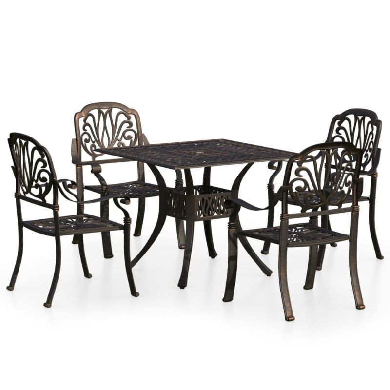 Този бистро комплект, изработен от лят алуминий, осигурява удобно преживяване при седене за вас и вашите гости. Градинските столове и маса, изработени от алуминий, са здрави и издръжливи. Устойчивият на ръжда и на атмосферни влияния материал прави комплекта мебели идеален за използване на открито. Красивите шарки правят бистро комплекта елегантно допълнение към вашето външно пространство. Освен това масичката за кафе има отвор за чадър, който може перфектно да побере чадъра ви, за да ви предпази от слънце или дъжд. Забележка: За да удължите живота на вашите градински мебели, препоръчваме ви да ги почиствате редовно и да не ги оставяте ненужно на открито без защита.Почистване: Използвайте мек сапунен разтворСъхранение: Ако е възможно, съхранявайте на хладно и сухо място на закрито. Ако продуктът се съхранява на открито, защитете го с водоустойчиво покривало. Избършете и изсушете излишната вода или сняг от плоските повърхности след дъжд или снеговалеж. Позволете достатъчно циркулация на въздуха, за да избегнете повреди, свързани с влагата. Максимално 110 кг на седалка.