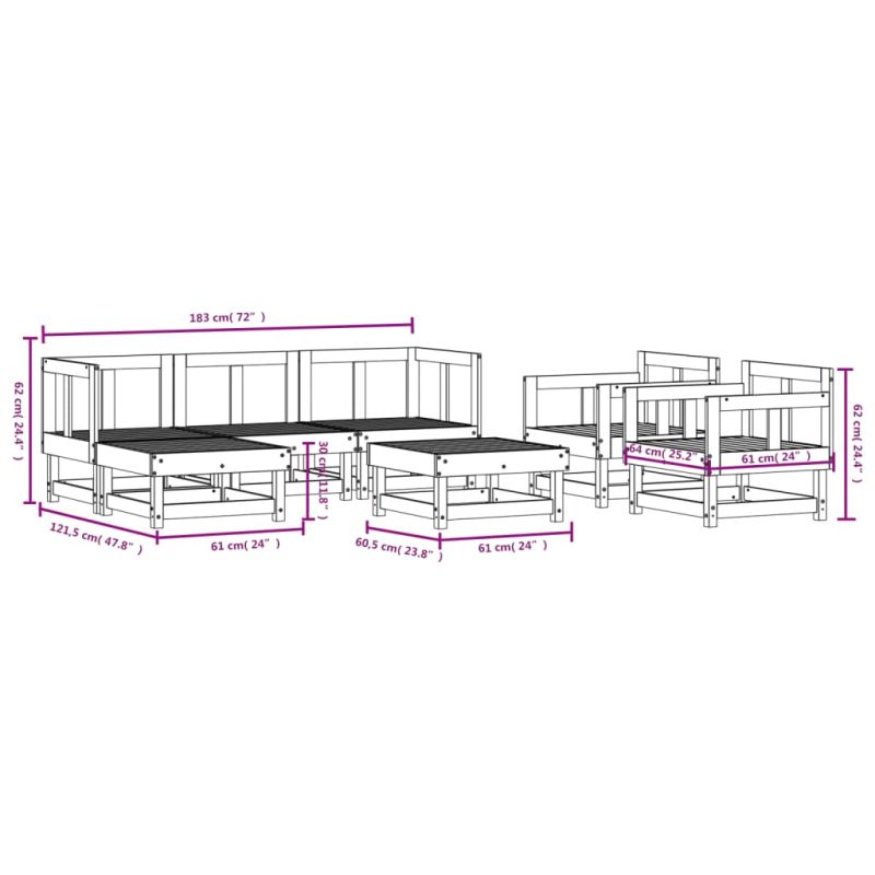 Този дървен градински лаундж комплект, който се откроява с дизайн на летви, ще бъде чудесно допълнение към вашата градина, вътрешен двор или тераса, за да се насладите на уютно време със семейството или приятелите си. Масивно дърво дугласка ела: Масивната дугласка дървесина е изключително издръжливо дърво, което е подходящо за използване на открито. Дугласката дървесина е достатъчно здрава, за да функционира с минимални грижи, дори под въздействието на атмосферните влияния.Здрава и стабилна рамка: Дървените рамки правят лаундж комплекта здрав и стабилен за ежедневна употреба на открито.Модулен дизайн: Комплектът мебели е гъвкав и лесен за преместване. Можете да я комбинирате с други модулни сегменти в уеб магазина, за да създадете свои лични конфигурации на градински лаундж комплект! Добре е да се знае:За да сте сигурни, че вашите външни мебели ще останат красиви, ви препоръчваме да ги защитите с водоустойчиво покривало.Възглавниците не са включени в доставката. Максимално 110 кг на седалка.