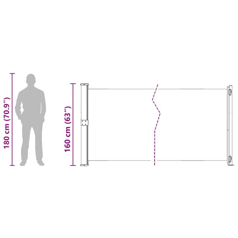 Този семпъл, но стилен страничен сенник създава уютно малко кътче, като същевременно осигурява уединение, от което се нуждаете във вашата тераса, вътрешен двор или балкон. Също така може да помогне за защита на хората от вятъра и ниското слънце. Платното е изработено от полиестер, който е устойчив на UV лъчи, атмосферни влияния и разкъсване. Касетата е монтирана върху здрава стоманена основа във вертикално положение, а прибиращата се тента може лесно да се изтегли навън. Тя се отличава и с функция за автоматично прибиране. Доставката включва и монтажни аксесоари.