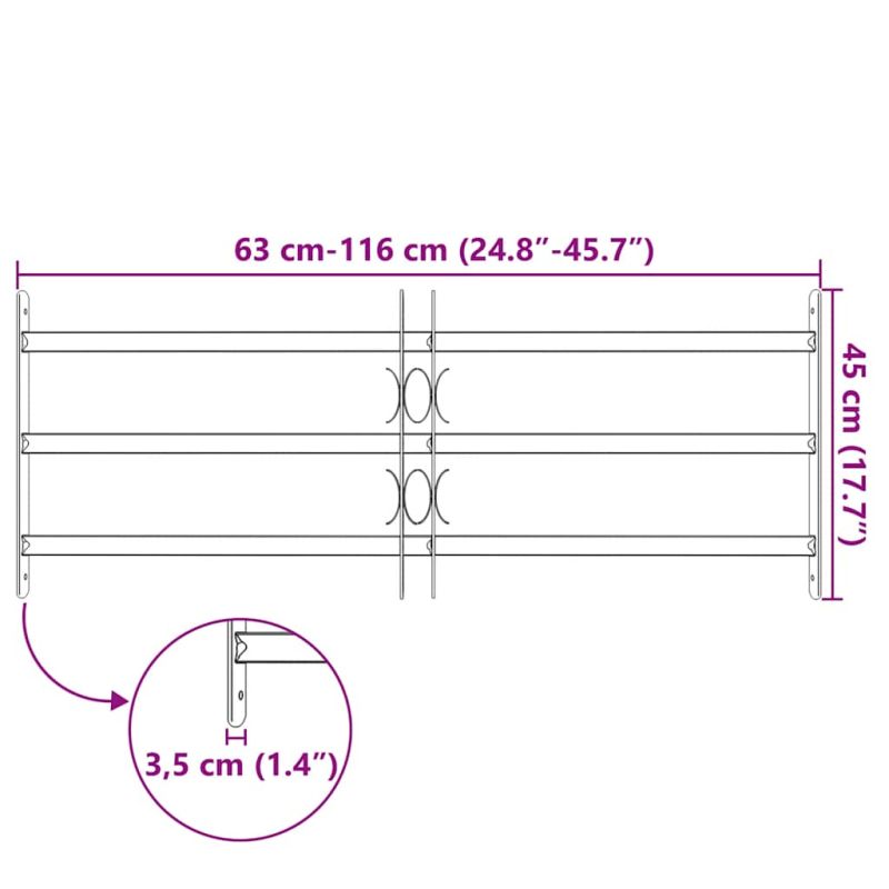 Тази охранителна решетка е произведена по висок стандарт и ще спомогне да се повиши сигурността на вашия дом или офис. Изработена от солидна поцинкована стомана, тази охранителна решетка с 3 напречни пръта е здрава и издръжлива и ще защити ефективно вашия имот от кражба с взлом. С декоративните си елементи решетката за прозорец добавя също докосване на стил към дома ви. Тази охранителна решетка може да се инсталира хоризонтално с регулирането на ширината от 700-1050 мм, за да пасне към размерите на различни прозорци. Нашата прозоречна решетка е не само мярка за сигурност, но чрез фината си изработка добавя и стилен елемент към дома ви. Сглобяването е лесно. Доставката включва и аксесоари за монтаж.